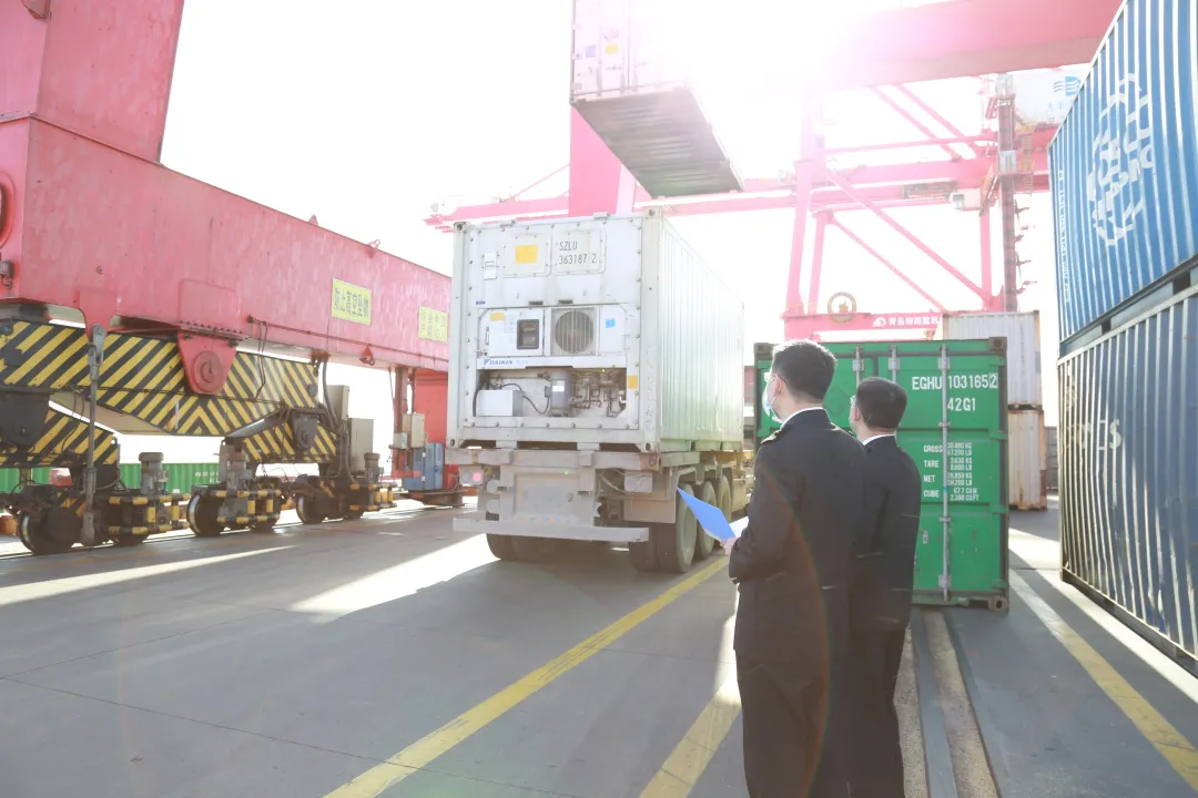 圖為:鹽城海關關員對“滬豐通”搭載的出口集裝箱貨物進行監管