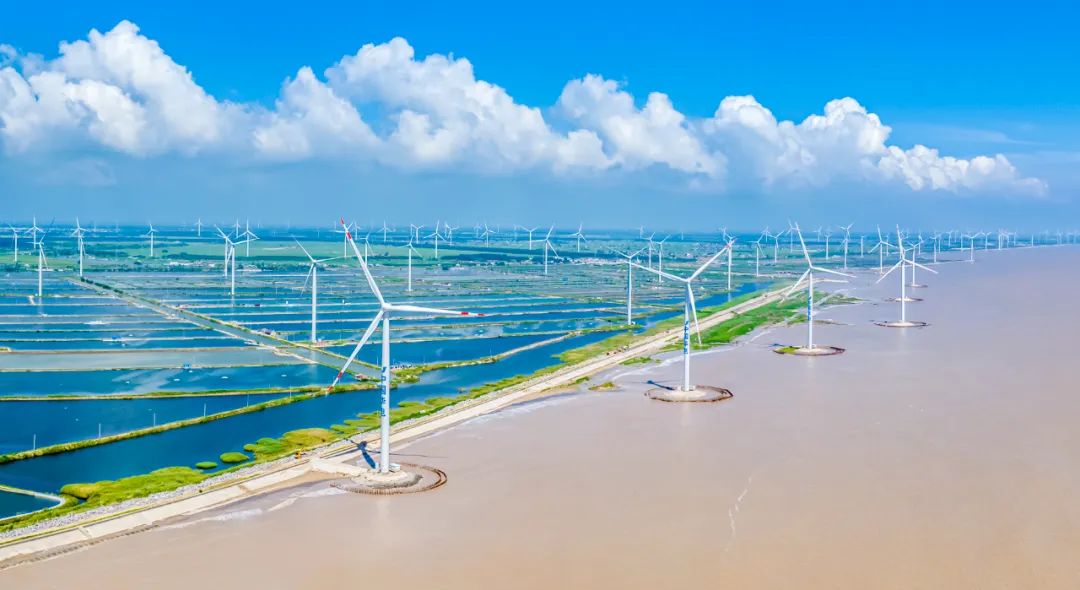 在東臺北條子泥海域和竹根沙海域,125臺風機隨風“起舞”。中國首個中外合資海上風電項目——國家能源集團和法國電力集團合資建設的國華東臺海上50萬千瓦風電項目,年均發電量約11億度,可滿足近200萬居民年用電需求。