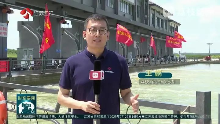 荔枝新聞中心記者王鵬說:“在淮河入海水道金湖控制線東偏泓,50臺(tái)臨時(shí)泵站正全力翻水,以12.5立方米每秒的流量全力抽引水源補(bǔ)給洪澤湖。”