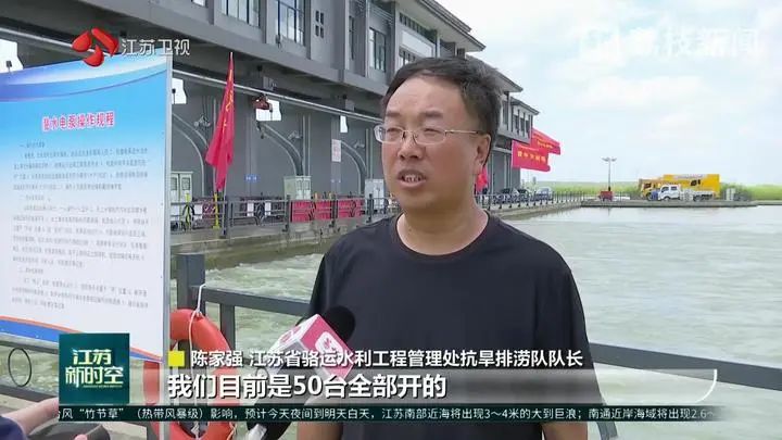 江蘇省駱運(yùn)水利工程管理處抗旱排澇隊(duì)隊(duì)長(zhǎng)陳家強(qiáng)說:“目前50臺(tái)全部打開,每臺(tái)0.25流量,總共12.5流量。一天大概翻110萬方水,從24日到現(xiàn)在共翻了255萬方水。”