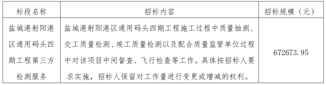 ⑴項(xiàng)目名稱:鹽城港射陽港區(qū)通用碼頭四期工程第三方檢測(cè)服務(wù)