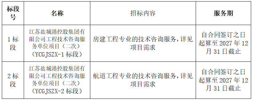 江蘇鹽城港控股集團(tuán)有限公司因工作需要,現(xiàn)通過(guò)公開招標(biāo)方式,選擇技術(shù)咨詢服務(wù)單位,請(qǐng)潛在的投標(biāo)人參加本服務(wù)采購(gòu)的投標(biāo)報(bào)名,現(xiàn)就有關(guān)事項(xiàng)公告如下。