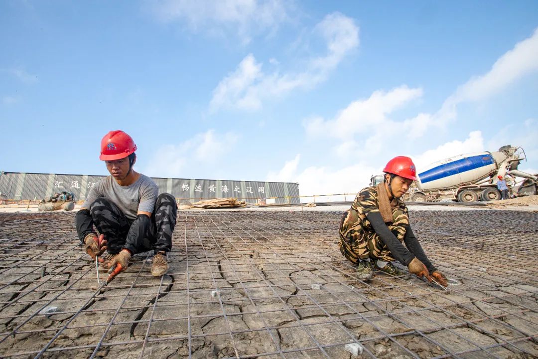 工人們正在進行船閘底板混凝土灌注