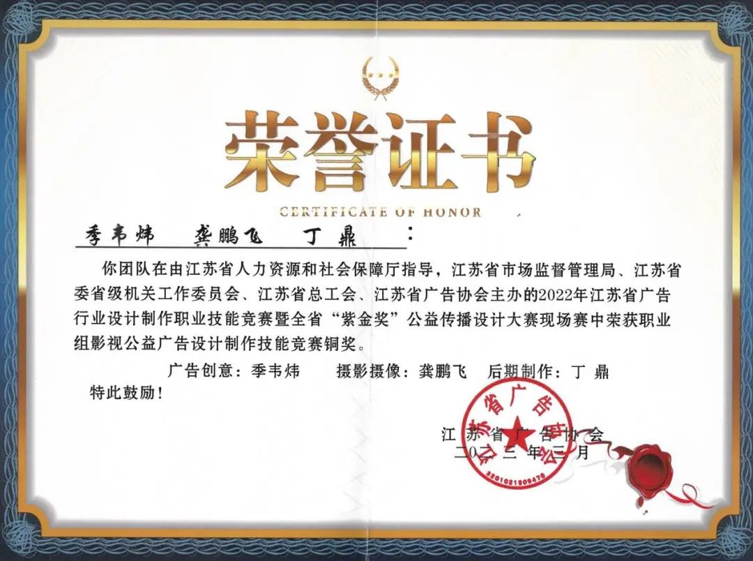 近日,由江蘇省人力資源和社會保障廳指導(dǎo),江蘇省市場監(jiān)督管理局、江蘇省委省級機(jī)關(guān)工作委員會、江蘇省總工會、江蘇省廣告協(xié)會主辦的2022年江蘇省廣告行業(yè)設(shè)計制作職業(yè)技能競賽暨全省“紫金獎”公益?zhèn)鞑ピO(shè)計大賽在南京圓滿收官。鹽城港文旅集團(tuán)廣告?zhèn)髅椒止緟①悎F(tuán)隊現(xiàn)場創(chuàng)作的《共圓強(qiáng)國復(fù)興夢》短視頻作品大賽榮獲職業(yè)組影視公益廣告設(shè)計制作技能競賽銅獎。