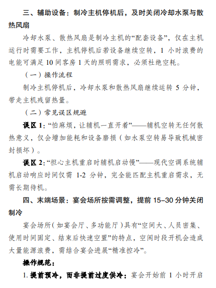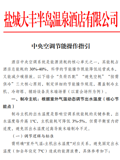 酒店專門編制空調節能操作指南,圍繞“負荷匹配、避免空耗、按需供冷”三大原則,通過靈活調節水溫、分時運行風機、合理預判宴會需求等方式,從設備運行到場景適配全流程優化,節電效果顯著。