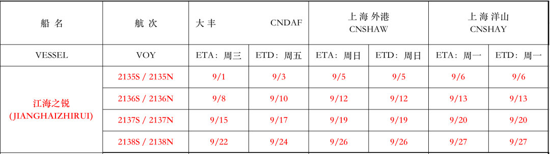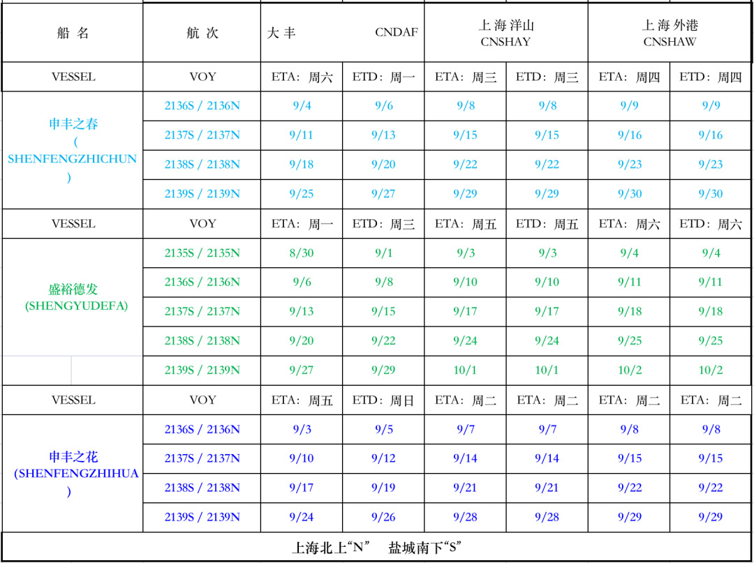 滬鹽專線2021年9月份船期表