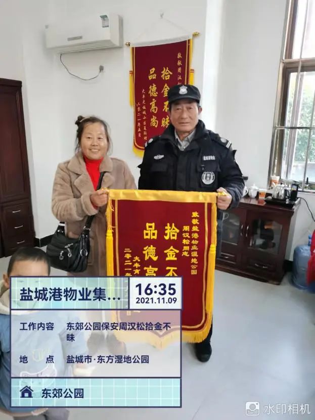 當天,失主沈女士特地將一面寫有“品德高尚、拾金不昧”的錦旗送到東郊公園,對周漢松拾金不昧的高尚品德再一次表示感謝。