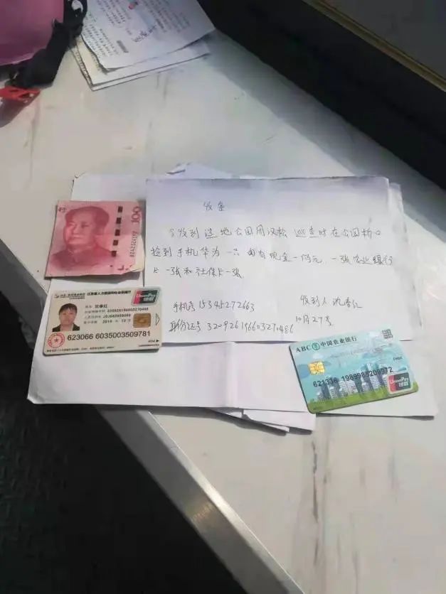 11月9日,鹽城港物業保安周漢松和往常一樣在所屬項目東郊公園內巡邏執勤,巡邏中發現馬路上“躺”著一部手機,經檢查手機外觀未損壞能亮屏,手機背面還有銀行卡、社保卡及少量現金。周漢松第一時間將現場情況進行上報,并時刻注意著手機來電。很快便接到了外來電話,來電人自稱是失主,周漢松在電話里告知對方方位,請對方到達現場進一步確認。