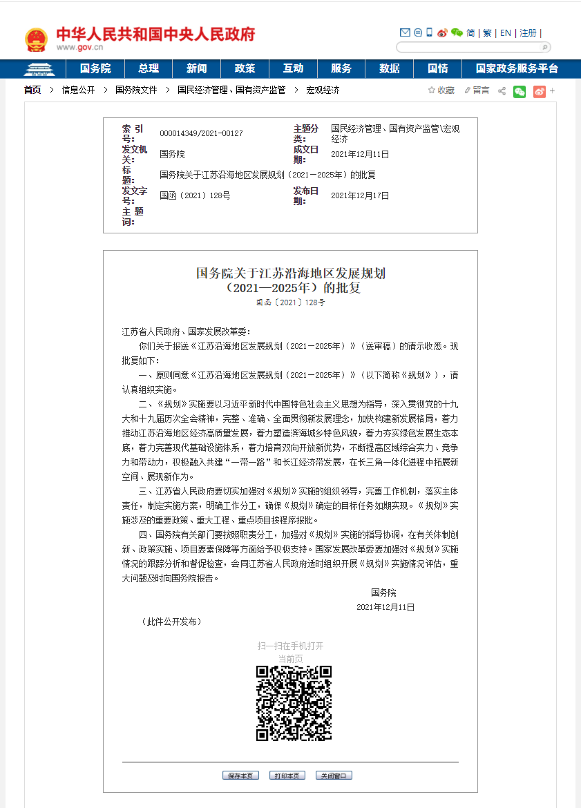 轉載:國務院關于江蘇沿海地區發展規劃(2021—2025年)的批復