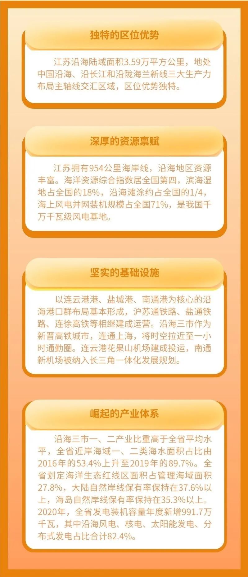 江蘇“十四五”規劃綱要明確,沿海地區深化港產城融合發展,著力提升海洋經濟、生態經濟和樞紐經濟,打造令人向往的生態風光帶、人海和諧的藍色經濟帶,成為新的增長極。江蘇省第十四次黨代會提出,全力推進沿海地區高質量發展,加快陸海統籌發展,大力發展海洋經濟,著力塑造“繽紛百里”“生態百里”“藍灣百里”濱海特色風貌,努力把沿海地區打造成綠色生態高質量發展經濟帶。