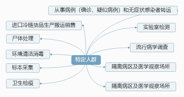 6.“特定人群”:在新冠肺炎疫情期間,從事病例(確診、疑似病例)和無(wú)癥狀感染者轉(zhuǎn)運(yùn)、尸體處理、環(huán)境清潔消毒、標(biāo)本采集、實(shí)驗(yàn)室檢測(cè)、流行病學(xué)調(diào)查、隔離病區(qū)及醫(yī)學(xué)觀察場(chǎng)所、衛(wèi)生檢疫、進(jìn)口冷鏈貨品生產(chǎn)搬運(yùn)銷(xiāo)售等工作的人群。