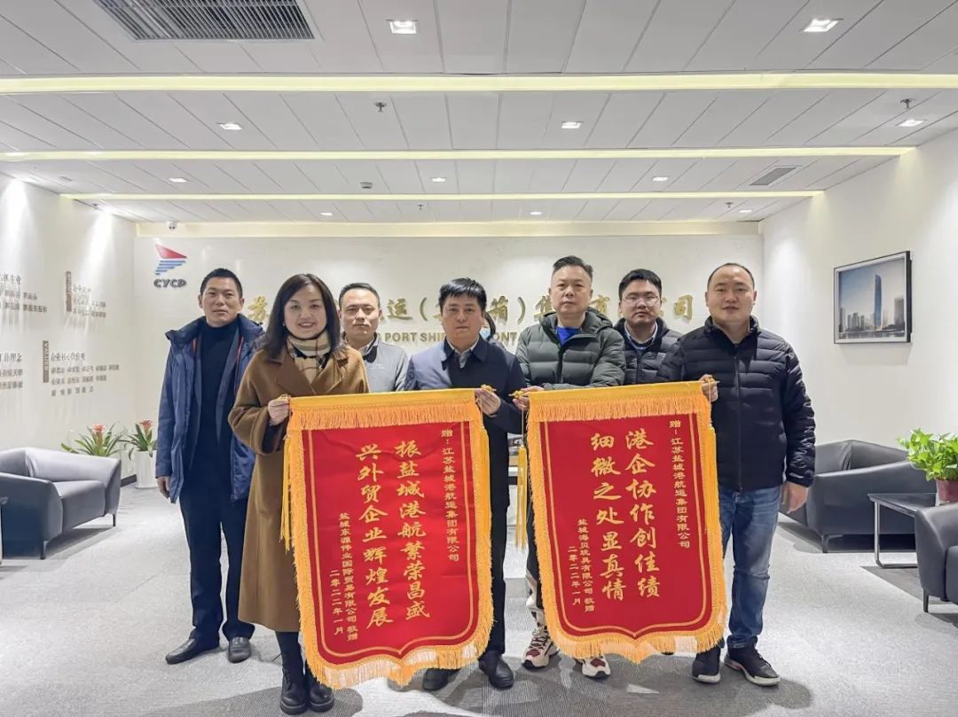 1月25日,農歷小年這一天,南京海聆夢、鹽城東源偉業和鹽城海貝玩具三家公司不約而同來到鹽城港航運集團,分別將寫有“高效服務心系企業”、“振鹽城港航繁榮昌盛,興外貿企業輝煌發展”、“港企協作創佳績,細微之處顯真情”的錦旗送到了公司班子手中,感謝航運集團一年來在貨物出運上給予的大力支持。