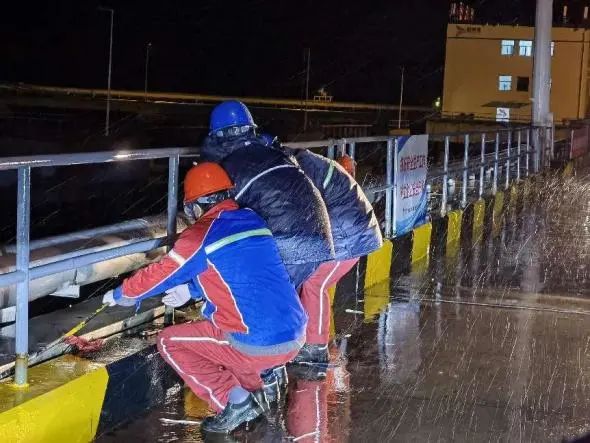 為了保障滾裝作業順利完成,糧食碼頭分公司檢修人員以車燈為照明,冒著大風大雨檢修線路。