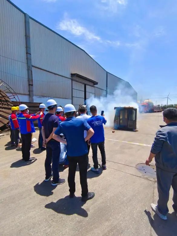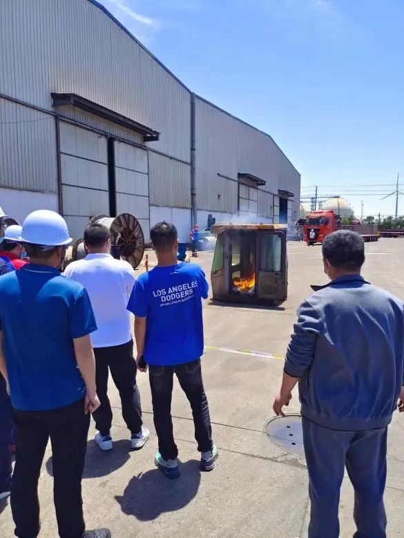 活動結束后,港機公司組織全體員工參與了流動機械設備滅火演練。演練分為氣體滅火和干粉滅火兩個實驗階段。通過實驗,干粉自動滅火實驗對于流動機械設備的火患具有更良好的滅火效果,可有效阻止火勢蔓延,最大程度減少損失。