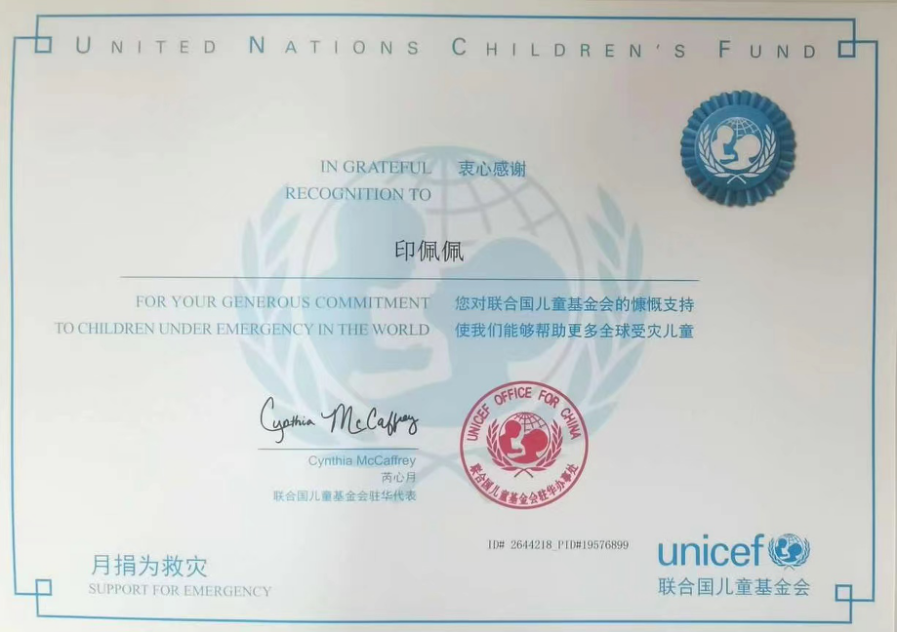 近年來,有越來越多的愛心單位、社會組織和義工、志愿者不斷參與關愛兒童行動,讓孩子可以在愛的陽光下健康快樂成長。今天,鹽城港港口公司“海燕”班組成員印佩佩同志收到了來自聯合國兒童基金會的捐獻證書。自去年加入“海燕”班組以來,印佩佩堅持每月向聯合國兒童基金會捐款,用最簡單、最直接的方式關注兒童、支持兒童、幫助兒童,為祖國花朵捐出一份愛心、奉獻一片真情。