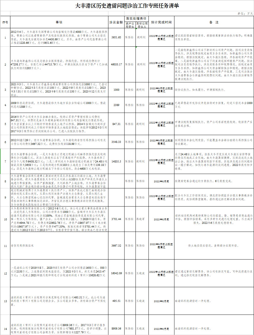 在“六清”的基礎上,梳理大豐港區歷史遺留問題診治工作專班任務清單計97項,并完成任務清單說明;完成江蘇大豐海港控股集團有限公司涉及“國企債券專項審計調查發現問題整改工作”,并將整改工作采取的措施和整改進展情況等形成工作報告上報大豐區國資委;共計處理處置大豐港區歷史遺留有問題往來74筆,金額8.09億元。截至5月31日已完成大豐港區歷史遺留問題診治工作專班任務清單計15項,涉及金額2.81億元。