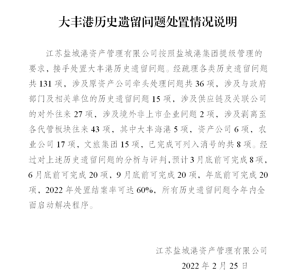 處理處置完成大豐港區閑置、低效資產2.58億元,其中:有問題在建工程0.49億元,有問題待攤費用0.54億元。目前正在加快推進奧特萊斯、和順環保科技、港鑫銅業、市民卡、水務公司、蘇港包裝等企業的資產處置工作。