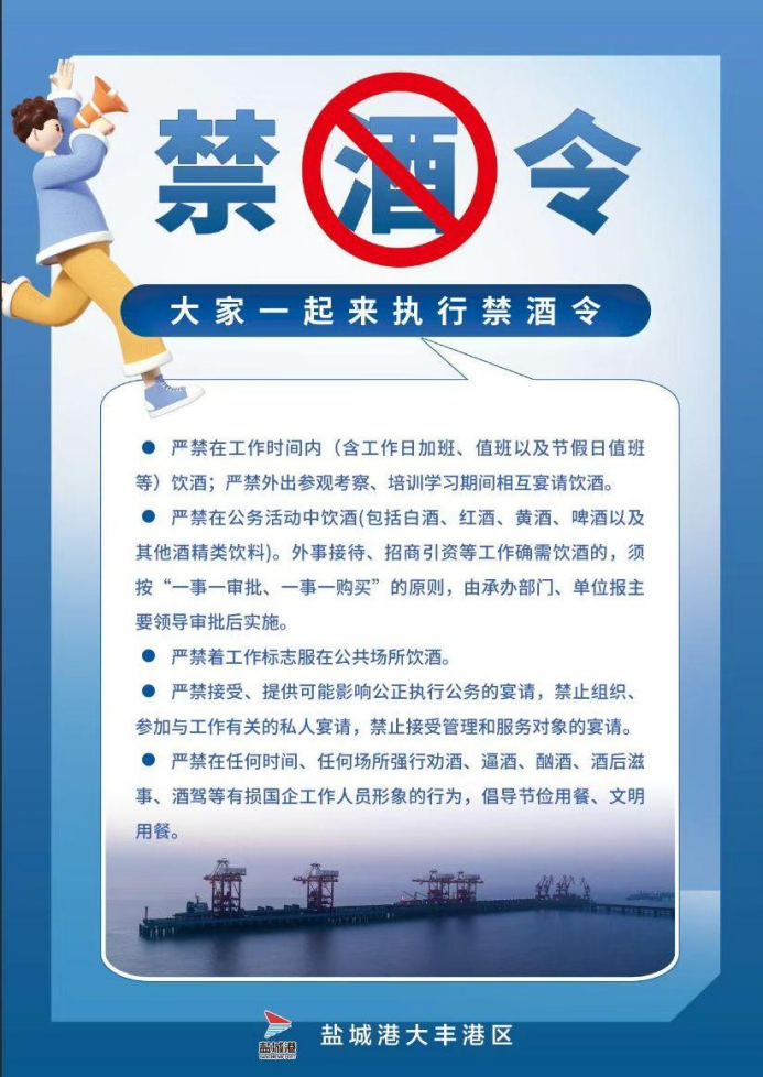 為貫徹全面從嚴治黨要求,加強工作紀律,營造風清氣正的良好環境,鹽城港大豐港區頒布最新禁酒令,要求大豐港區全體干部職工在工作時間、公務活動等情況下,一律禁止飲酒,以維護鹽城港集團員工的良好形象。
