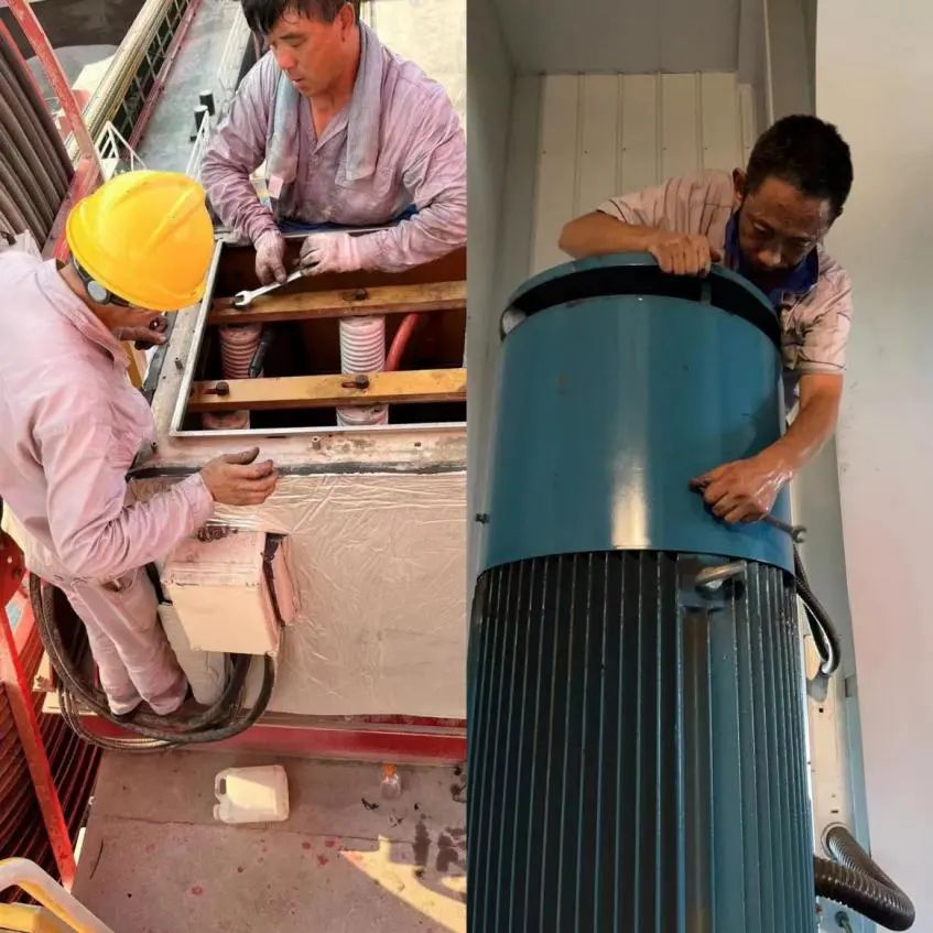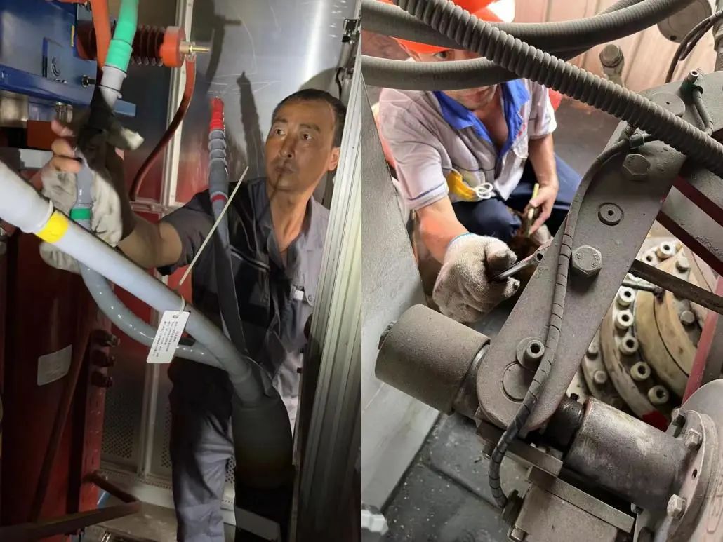 天氣炎熱,設備也?!爸惺睢??!?#門機出現分波過熱故障,門機跳電了”,早上7點,剛到港的修理電工大宋就接到前方司機的報修指令。大宋隨即和同伴趕到現場,經過排查,發現是左旋電機風機損壞。經過2個多小時的搶修,設備再次順利投入使用。搶修人員剛下門機還沒來得及喝口涼水,對講機里又傳來了1#門機整機跳電故障報修。經檢查判定這是一起因電纜滑環內外溫差導致設備內部有水凝造成的設備故障。此時戶外的溫度已達35℃,而門機機房經過陽光的烘烤已近40℃,搶修人員卻毫不遲疑,立即投入搶修工作......