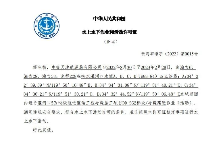 8月30日至31日,連云港海事局陸續(xù)簽發(fā)灌河口5萬噸級(jí)航道整治工程導(dǎo)堤施工一標(biāo)段和二標(biāo)段水上水下活動(dòng)許可證,標(biāo)志導(dǎo)堤工程施工前手續(xù)全部完成,為灌河口5萬噸級(jí)航道整治工程的全面開展邁出了重要一步。