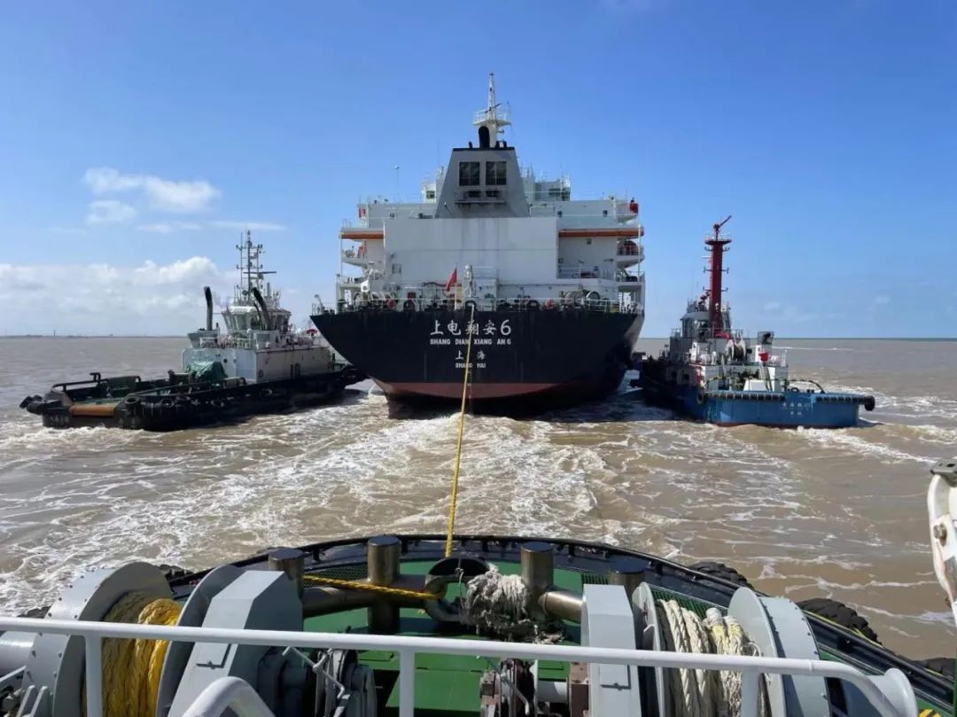 中午12時,在引航員的指揮下,現場拖輪步調一致,統一行動。在靠離泊過程中,持續加強海事、引航、拖輪、碼頭、船舶五方協同聯動,不斷調整角度和拖力,歷經3個小時的努力,圓滿完成了200米船舶的靠離泊等多項任務。