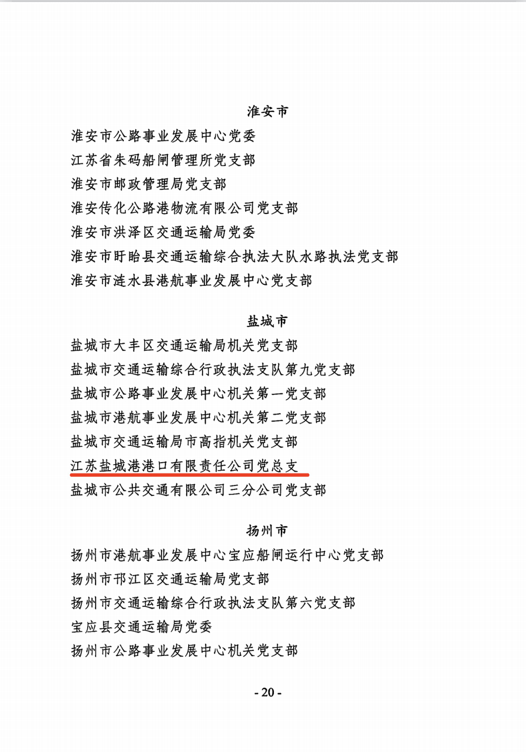 喜報!江蘇鹽城港港口有限責任公司黨總支榮獲“全省交通運輸行業先進基層黨組織”榮譽稱號