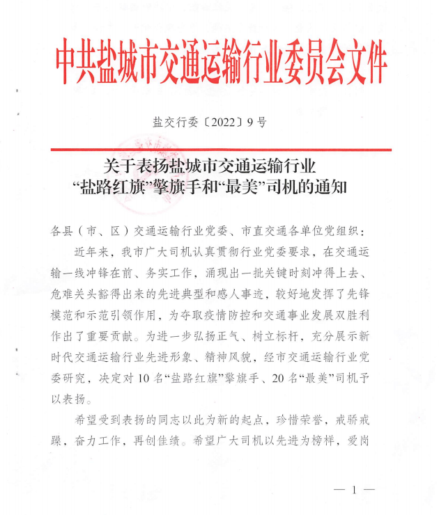 近日,中共鹽城市交通運(yùn)輸行業(yè)委員會(huì)印發(fā)《關(guān)于表?yè)P(yáng)鹽城市交通運(yùn)輸行業(yè)“鹽路紅旗”擎旗手和“最美”司機(jī)的通知》,集團(tuán)大豐港區(qū)王伯亮榮獲“鹽路紅旗”擎旗手榮譽(yù)稱號(hào),集團(tuán)響水港區(qū)蔣鶴山榮獲“最美”司機(jī)榮譽(yù)稱號(hào)。