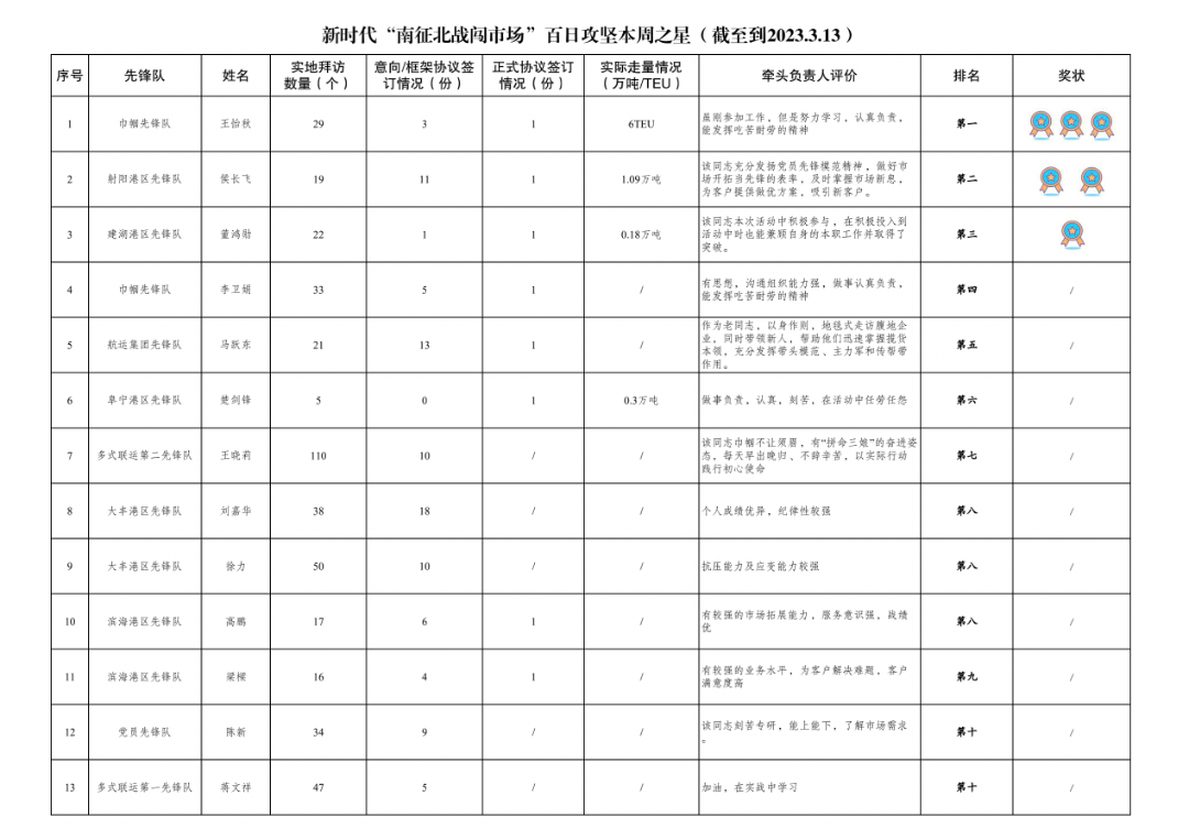 第一名:巾幗先鋒隊 王怡秋(拜訪客戶29家、簽訂意向協(xié)議3份,簽訂正式協(xié)議1份,實(shí)際走量6TEU)