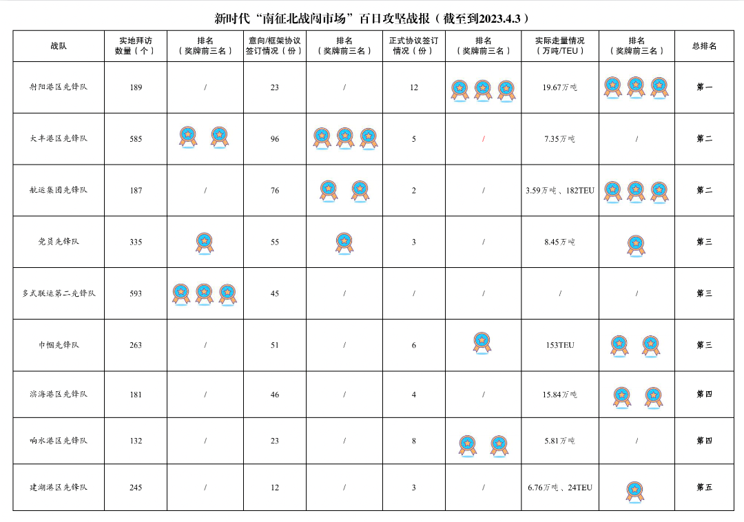 1.累計拜訪客戶數量3294家:其中多式聯運第二先鋒隊593家,大豐港區先鋒隊585家,黨員先鋒隊335家,巾幗先鋒隊263家,建湖港區先鋒隊245家,多式聯運第一先鋒隊223家,射陽港區先鋒隊189家,航運集團先鋒隊187家,濱海港區先鋒隊181家,響水港區先鋒隊132家,亭湖港區先鋒隊131家,阜寧港區先鋒隊117家,青年先鋒隊113家。