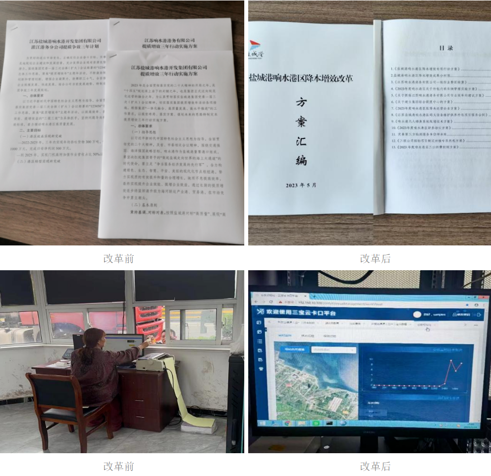 “降本增效”不僅是此次改革期間的重點工作,也是響水港區以及集團全年度的重點工作。通過深入一線調研,集團戰略規劃部在充分吸收采納集團各部門意見的基礎上,圍繞關鍵環節深挖降本節支潛在點,形成《鹽城港響水港區降本增效專項行動方案匯編》,通過11項有效措施全力推進響水港區降本增效工作。通過優化作業流程,完善勞務外包模式,預計實現2023年底較2022年單噸一線作業成本下降5%,節省約240萬維保成本;完成無人磅房試點改造,預計實現年約42萬元人工成本的節約;完善第三方檢測服務樣本庫,實現項目檢測成本5%-10%的降低;推進設立招標專員,實現招標(自主實施項目)審批流程節約8個工作日,效率提升33%;制定三公經費控制方案,預計年底實際費用支出降幅較2022年達到10%。
