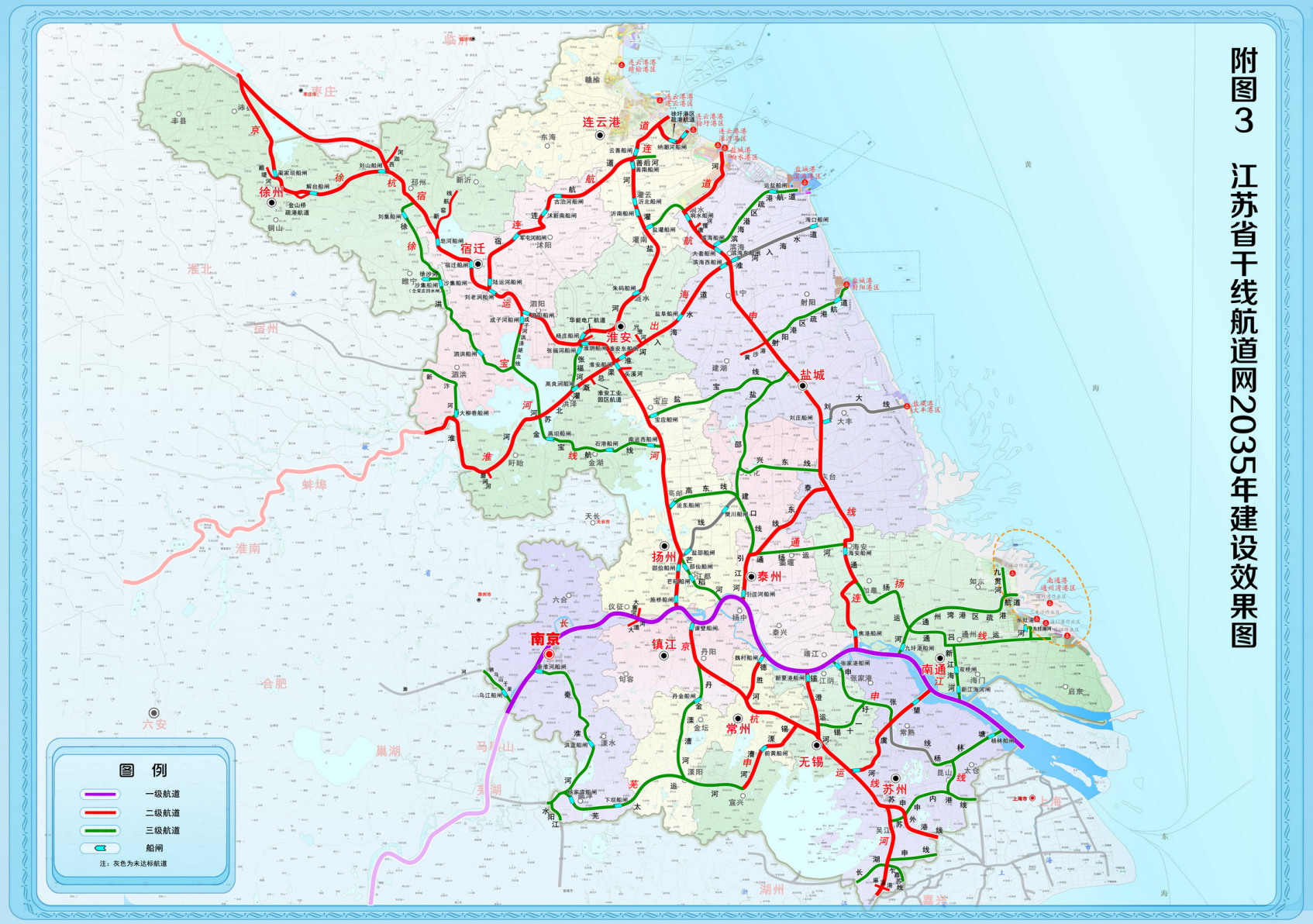 《規(guī)劃》明確,至2035年,全省干線航道網(wǎng)規(guī)劃總里程4192公里,總體呈現(xiàn)“兩縱五橫”的布局形態(tài),形成以長江干線、京杭運河、淮河國家水運主通道為核心,二級及以上航道為主體、三級航道為支撐的“聯(lián)網(wǎng)暢通、達(dá)海通江、優(yōu)質(zhì)高效、保障有力”的干線航道網(wǎng)絡(luò)。