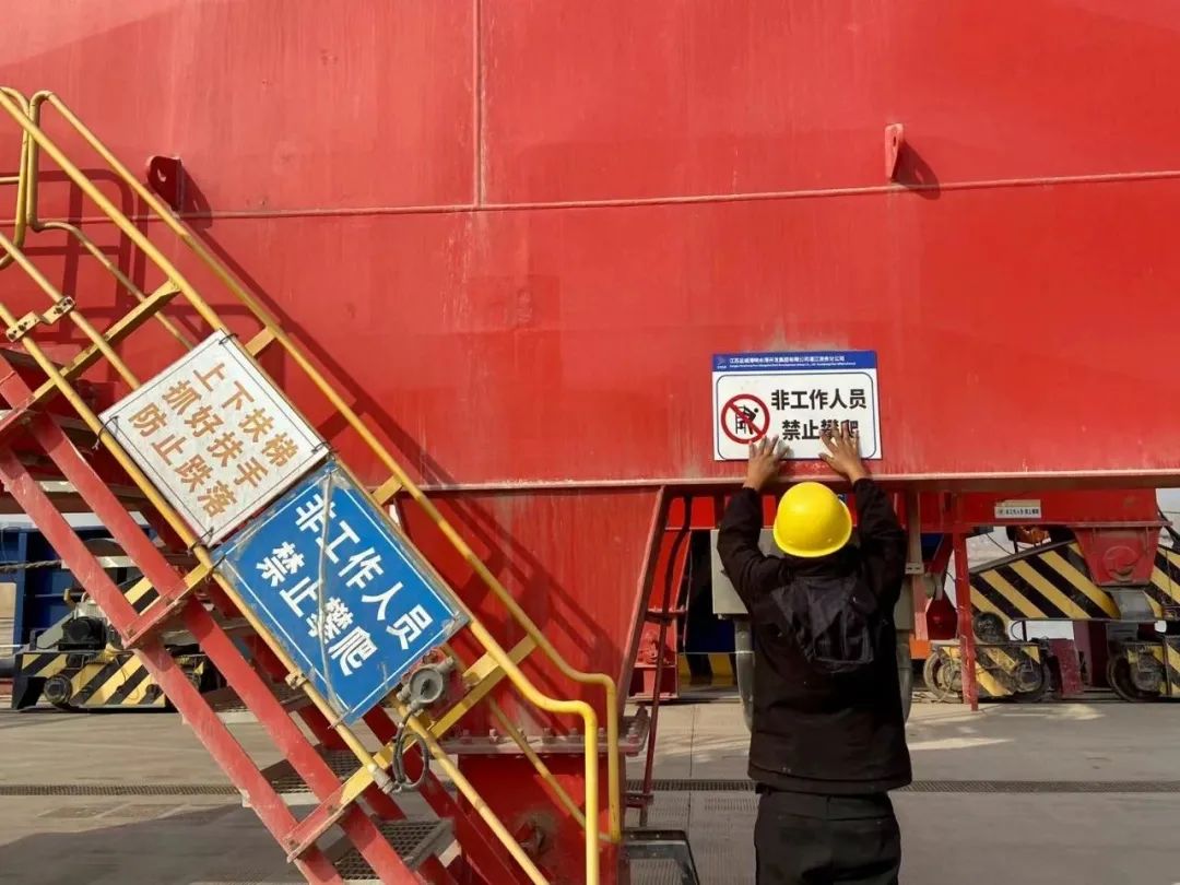 在港區門閘處設置“非作業車輛、工作人員禁止入內”標識,提示社會人員、車輛不要誤闖誤入港區。在引橋欄桿上懸掛“注意路口,當心貨車”“禁止酒后上崗,必須戴安全帽”等標識,提醒工作人員注意自身安全,嚴肅上崗紀律;在碼頭后沿護欄上懸掛“禁止翻越”“水深危險,禁止靠近”,警示工作人員不要翻越碼頭護欄,遠離危險水域。本次完善新增警示標識牌共十余塊。