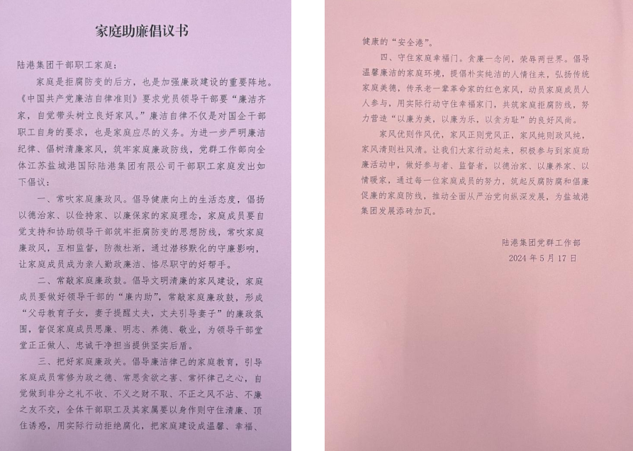 家庭齊心助廉。“為進(jìn)一步嚴(yán)明廉潔紀(jì)律、筑牢家庭廉政防線,黨群工作部向全體陸港集團(tuán)干部職工家庭發(fā)出如下倡議……”在警示教育大會(huì)上,陸港集團(tuán)黨群工作部向全體干部職工發(fā)出了《家庭助廉倡議書》,引導(dǎo)干部職工家屬常吹“家庭廉潔風(fēng)”,做好“家庭廉內(nèi)助”,把好“家庭廉潔門”,以清廉家風(fēng)抵御腐敗歪風(fēng),齊心協(xié)力,共同織密“家庭護(hù)廉網(wǎng)”。
