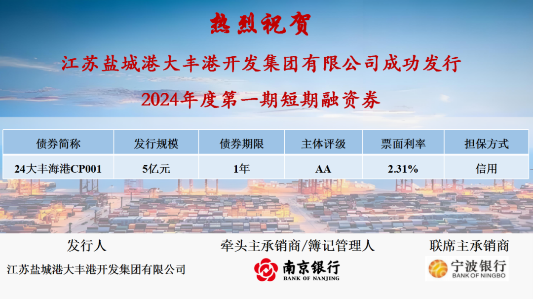 6月11日,大豐港開發(fā)集團2024年度第一期短期融資券成功發(fā)行,簿記金額5億元,發(fā)行利率2.31%,認購2.78倍,創(chuàng)大豐港開發(fā)集團成立以來發(fā)行利率新低。