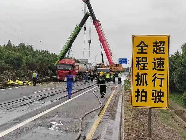 根據(jù)現(xiàn)場險情,公安交警部門第一時間封鎖事故現(xiàn)場,禁止一切車輛靠近,消防大隊出動消防車對事故車輛罐體進行噴射冷卻,聯(lián)系吊車對其進行罐體扶正工作,隨后由危化品運輸公司救援搶險隊使用相關(guān)設(shè)備將泄漏罐車內(nèi)的“高沸點芳烴”進行抽取,并轉(zhuǎn)移至指定安全區(qū)域。