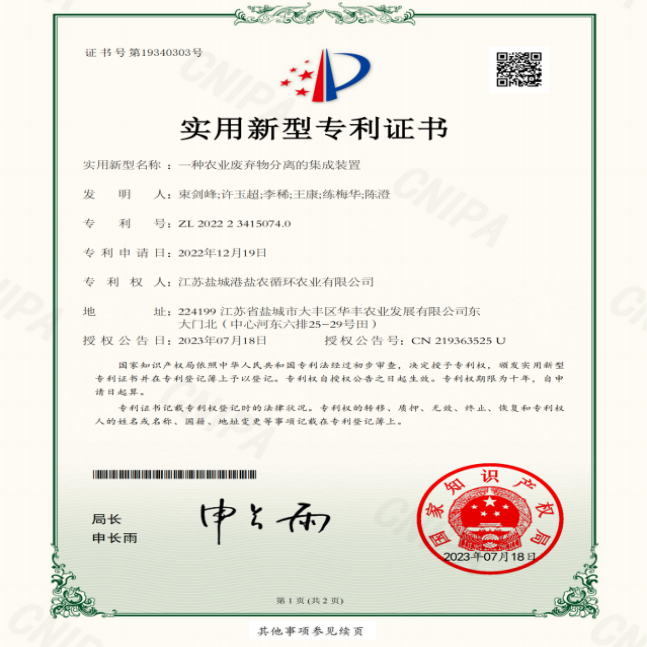 扎實推進科研創新,不斷將理論研究成果轉化到實際生產過程與產品中,截至目前,鹽農循環農業先后取得了3個肥料登記證,獲得自主研發專利24項(其中發明專利4項),另外還有15項專利已受理。率先使用新型機械沼液還田機,實現沼液在旱作物大面積推廣施用,替代70%以上化肥用量,將理論轉化為實際。“沼液在稻麥輪作上施用技術規范”地方標準成功立項,為沼液推廣應用打下堅定的基礎。 申報成功國家高新技術企業、江蘇省農業科技型企業、江蘇省三星上云企業、市級農業產業化龍頭企業等稱號。與揚州大學等高校共同申報的2022年江蘇省碳達峰碳中和科技創新專項資金項目-沿海灘涂農田生態碳匯能力提升模式構建和試驗示范基地建設也正在按進度穩步推進。