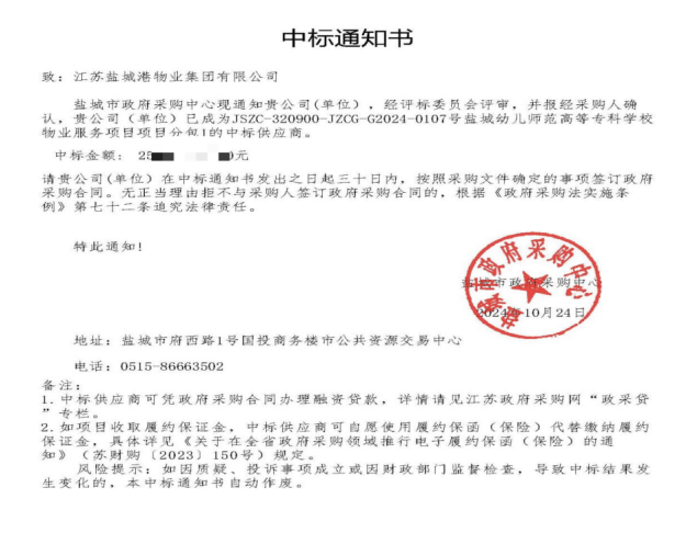 金秋十月,碩果累累,鹽城港物業公司成功中標鹽城幼兒師范高等??茖W校物業服務項目,在鹽城大市區外拓市場中實現新突破!項目新增“宿管”“安全員”等服務內容,總服務面積12余萬平方米,中標金額200余萬元,為在管項目領域再添新業績!