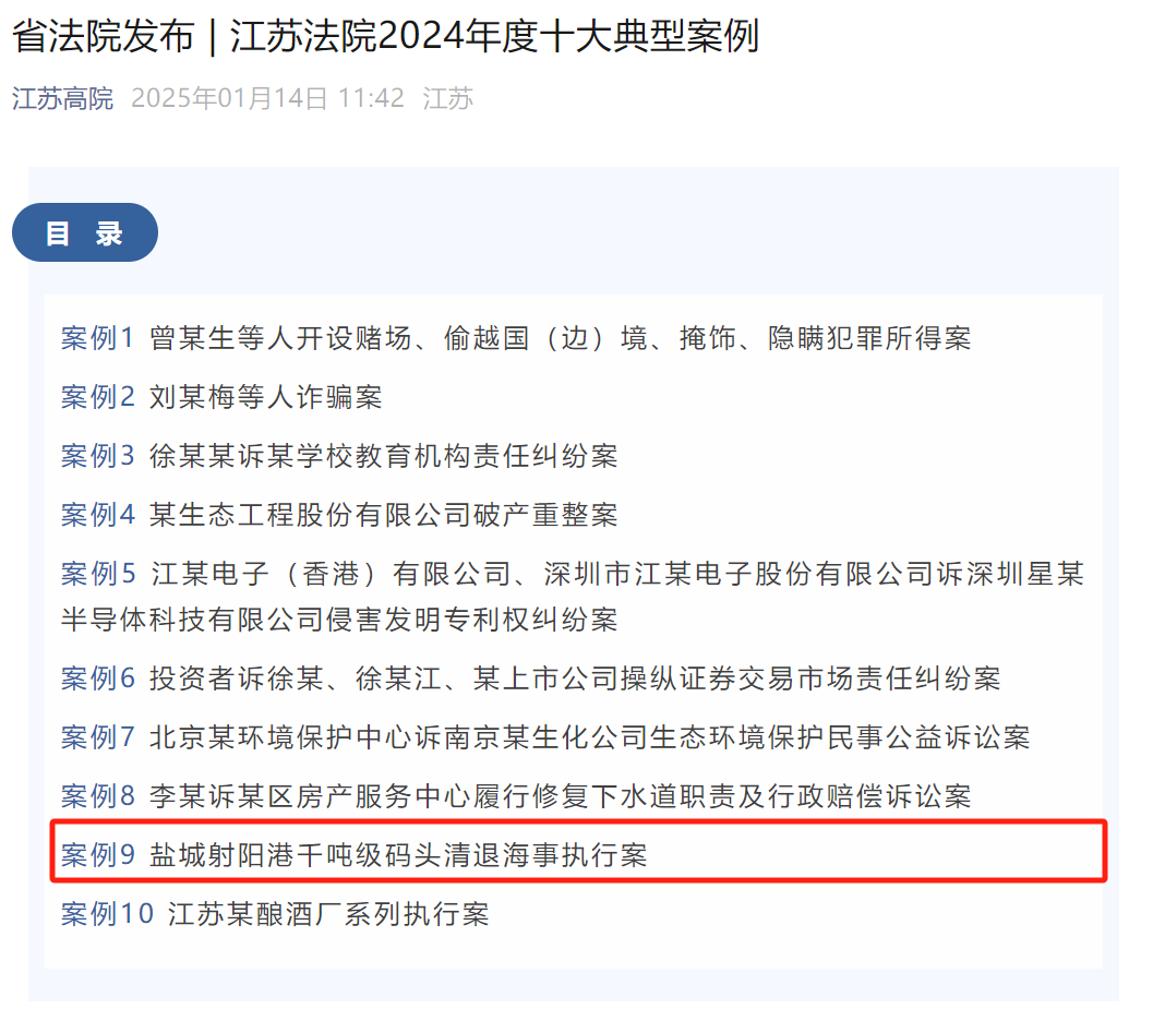 2025年1月14日,江蘇省高級人民法院發布2024年十大典型案例,鹽城港射陽港千噸級碼頭清退海事執行案成功入選。