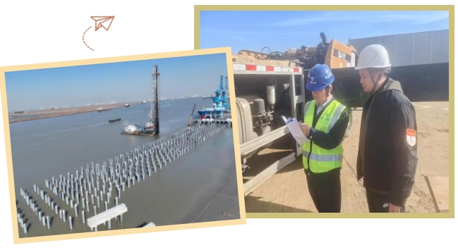 在射陽港區四期碼頭項目現場,黑色的工裝身影隨處可見。他們是項目建設的“主力軍”,或指揮操作,或檢查隱患,或測量數據,每個人都堅守在自己的崗位上。正以昂揚的姿態,向著年度目標穩步邁進,將碼頭的藍圖一步步變為現實。