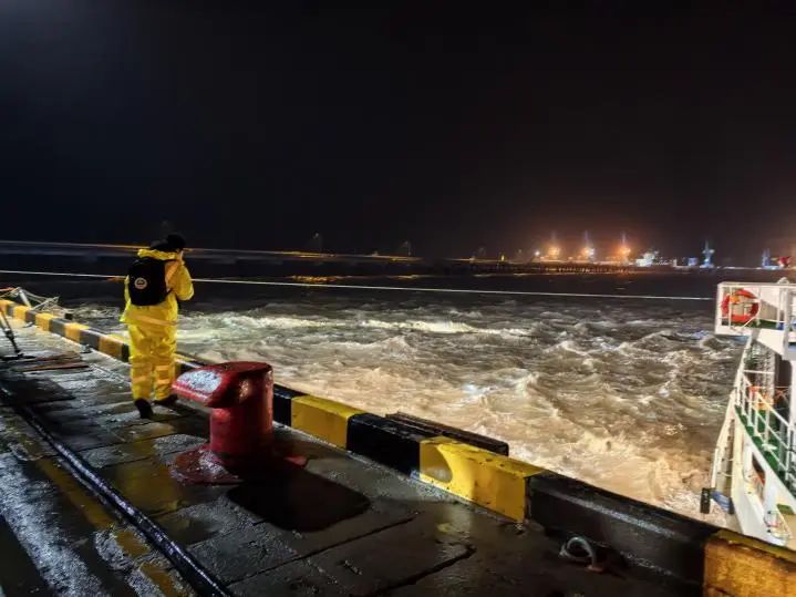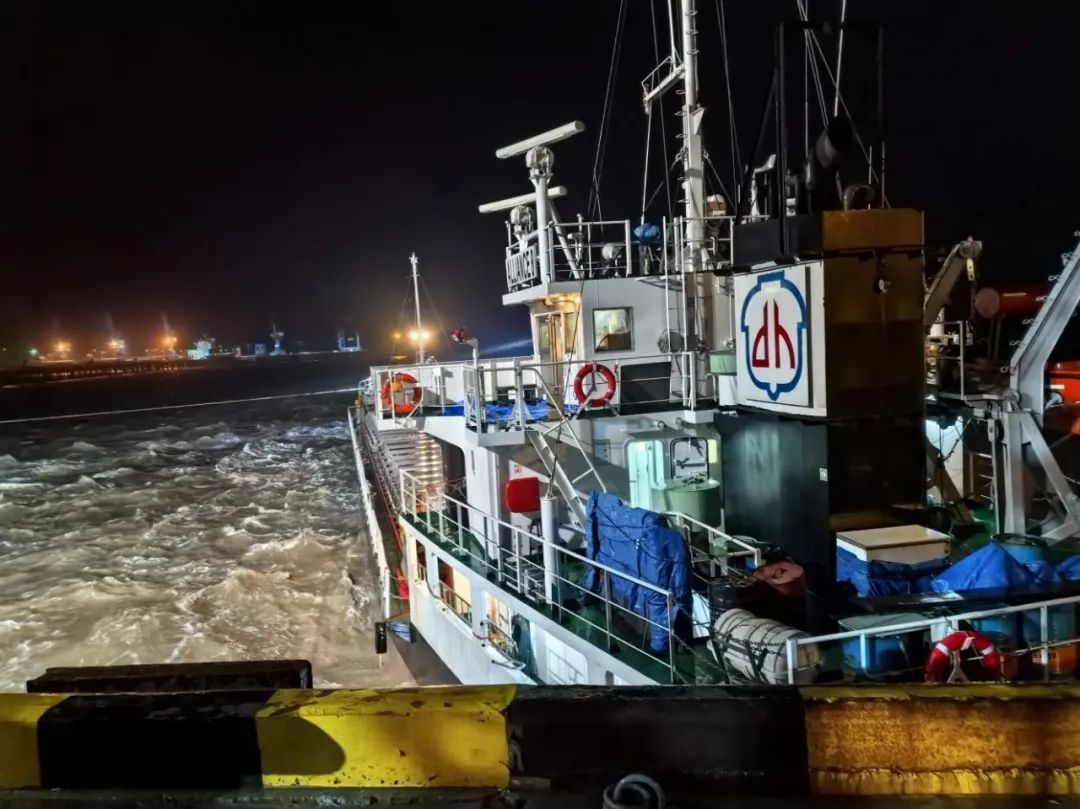 當(dāng)晚正值農(nóng)歷大潮汛,東北風(fēng)6級、涌浪2米的惡劣海況給救援帶來嚴(yán)峻挑戰(zhàn)。引航員抵達現(xiàn)場時,“聯(lián)盟8”輪船頭僅剩1根倒纜受力,船體與碼頭形成60°夾角持續(xù)后漂,且涌浪過大導(dǎo)致無法登輪指揮。面對險情,引航員在碼頭前沿與交管中心協(xié)同決策,果斷采取“解尾纜、控船位”的應(yīng)急處置方案。