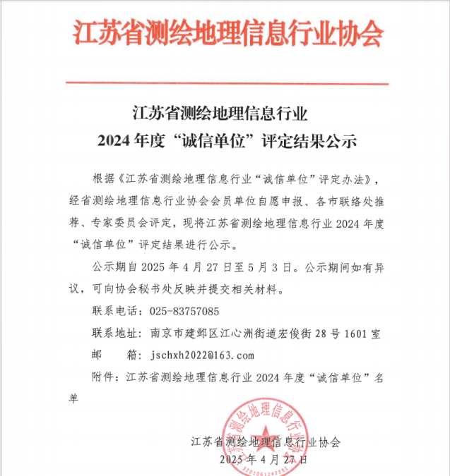 近日,江蘇省測(cè)繪地理信息協(xié)會(huì)正式發(fā)布2024年度行業(yè)"誠(chéng)信單位"評(píng)選結(jié)果,鹽城港港航勘測(cè)設(shè)計(jì)有限公司憑借卓越的誠(chéng)信經(jīng)營(yíng)表現(xiàn)和專業(yè)技術(shù)實(shí)力,成功獲評(píng)此項(xiàng)殊榮,不僅是對(duì)企業(yè)誠(chéng)信體系建設(shè)的高度認(rèn)可,更是對(duì)其在測(cè)繪地理信息領(lǐng)域?qū)I(yè)能力和服務(wù)質(zhì)量的全面肯定。