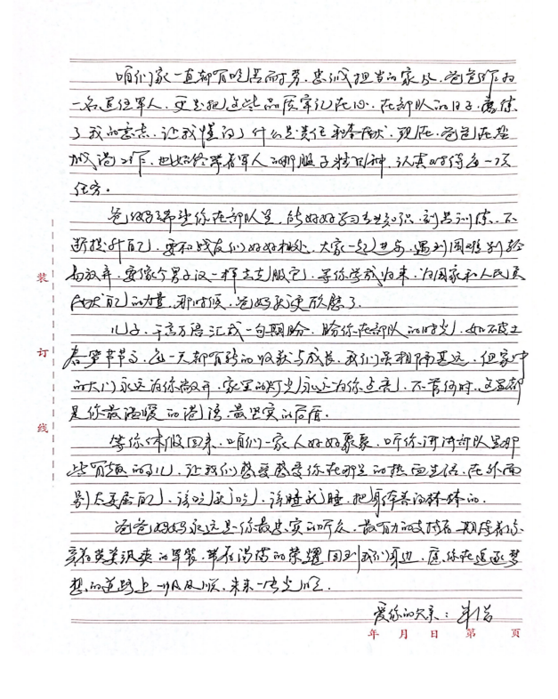 字里行間流露出對雙親的敬仰之情,細數在軍旅或職場中的成長點滴,并鄭重承諾將“忠誠、奮進”的家風薪火相傳,以實際行動回饋家庭與社會,同時深切期盼家庭團聚的美好時光。