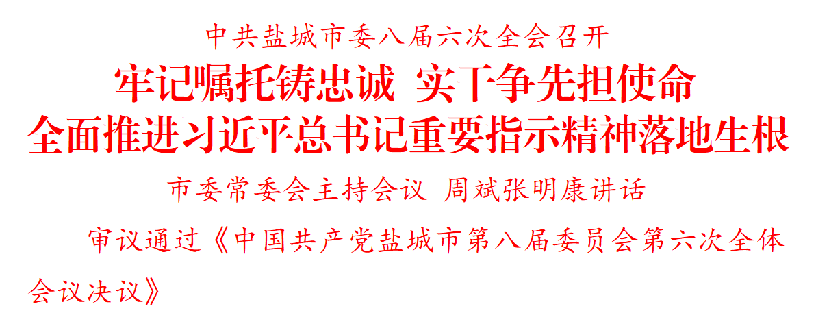 全會審議通過《中國共產黨鹽城市第八屆委員會第六次全體會議決議》,討論了《中共鹽城市委常委會2023年度工作情況報告》《中共鹽城市委常委會2023年度落實全面從嚴治黨主體責任情況報告》。