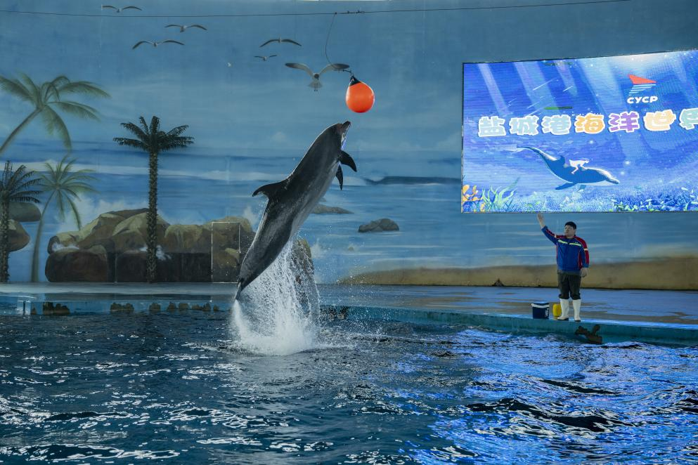 海洋世界劇場里的小海豚個個“身懷絕技”,在空中飛躍、水中漫步,上演一場場視覺盛宴,也帶來“港口+文旅”的海洋旅游新模式。