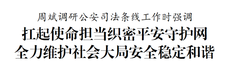 在調(diào)研中,周斌指出,公安司法條線是維護(hù)社會穩(wěn)定的“主力軍”、服務(wù)高質(zhì)量發(fā)展的“護(hù)航員”。要突出政治引領(lǐng),服務(wù)發(fā)展大局,圍繞優(yōu)化營商環(huán)境、護(hù)航產(chǎn)業(yè)發(fā)展、保障民生福祉等中心任務(wù),找準(zhǔn)工作切入點(diǎn)和發(fā)力點(diǎn),為高質(zhì)量發(fā)展提供堅(jiān)強(qiáng)法治保障。要深化社會治理,堅(jiān)持和發(fā)展新時代“楓橋經(jīng)驗(yàn)”,完善網(wǎng)格化管理、精細(xì)化服務(wù)、信息化支撐的基層治理平臺,提升社會治理現(xiàn)代化水平。要堅(jiān)守人民立場,聚焦群眾“急難愁盼”,扎實(shí)推進(jìn)平安建設(shè)、掃黑除惡、未成年人保護(hù)等工作,不斷增強(qiáng)人民群眾的獲得感、幸福感、安全感。