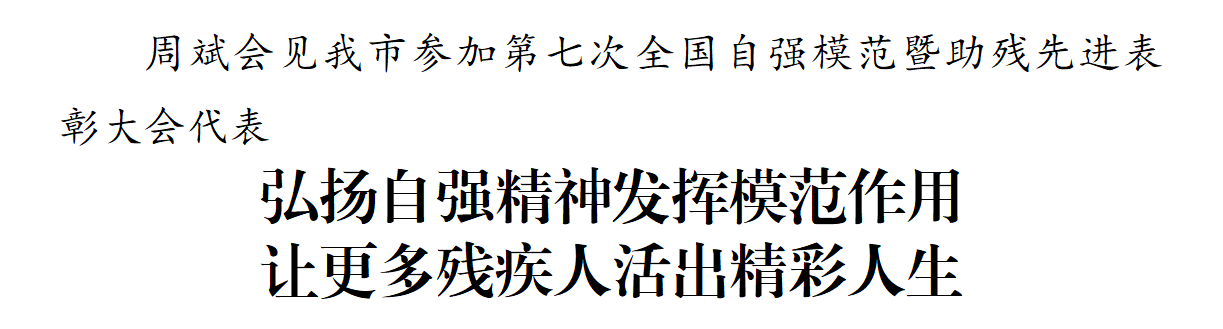5月26日,市委書(shū)記周斌會(huì)見(jiàn)我市參加第七次全國(guó)自強(qiáng)模范暨助殘先進(jìn)表彰大會(huì)代表,向受表彰對(duì)象表示祝賀,向全市廣大殘疾人和殘疾人工作者致以問(wèn)候,希望全市上下認(rèn)真學(xué)習(xí)貫徹習(xí)近平總書(shū)記關(guān)于殘疾人事業(yè)的重要指示精神,全面落實(shí)中央和省委部署要求,讓更多殘疾人活出精彩人生,在新征程上推動(dòng)我市殘疾人事業(yè)高質(zhì)量發(fā)展。