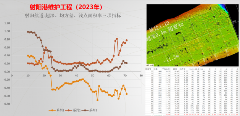 項目管理團隊積極開展港航項目工藝創(chuàng)新,一是采用氣泡式拖耙利用退潮流減淤工藝,使耙吸船在高濃度泥沙條件下的施工效率得到顯著提高。二是采用基于均方差、淺點率、平均超深三項指標的耙吸船、耙平器掃淺施工工法,合理評估耙吸船施工質(zhì)量及耙平器的施工效率,確定耙吸船和耙平器的匹配和數(shù)量,有效減少了超挖方量,提高了施工效率,降低了疏浚成本。