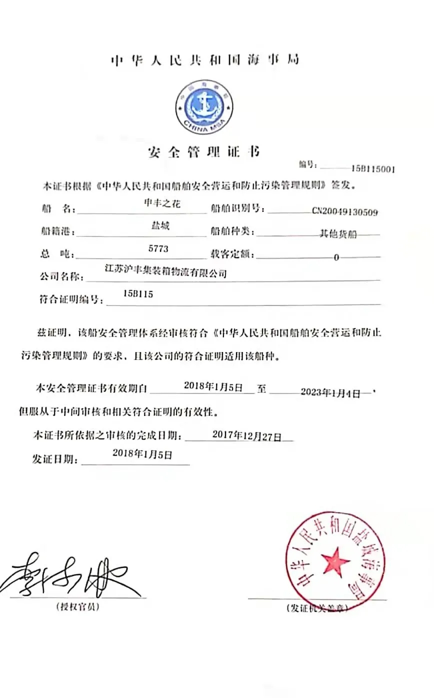審核組根據NSM規則對滬豐公司安全管理體系進行了覆蓋性審核,重點查看了體系文件修改情況、船舶各項安全與防治污染管理活動開展情況等。審核組綜合判定滬豐公司安全管理體系文件的覆蓋面、適用性符合實際,岸基對船舶的保障支持可靠及時,體系運行良好,一致同意江蘇滬豐集裝箱物流有限公司通過安全管理體系年度審核,給予公司DOC證書年度簽注。