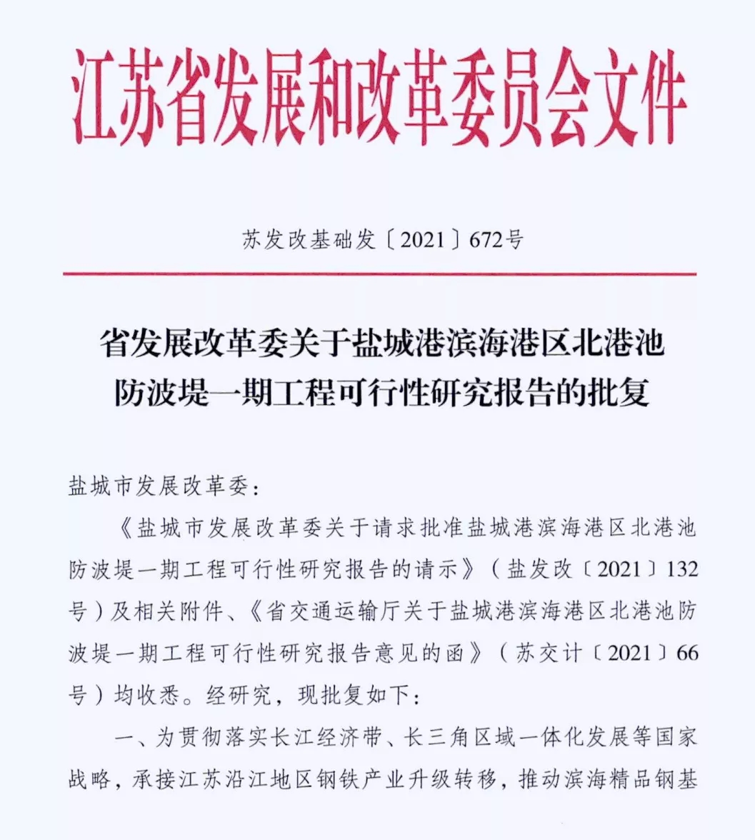 近日,交通運(yùn)輸部批復(fù)鹽城港濱海港區(qū)主港池北區(qū)通用碼頭三期工程使用港口岸線的請(qǐng)示(交規(guī)劃函〔2021〕362號(hào))、省發(fā)展改革委批復(fù)鹽城港濱海港區(qū)北港池防波堤一期工程可行性研究報(bào)告(蘇發(fā)改基礎(chǔ)發(fā)〔2021〕672號(hào)),標(biāo)志濱海港區(qū)重大項(xiàng)目前期工作取得突破性進(jìn)展。